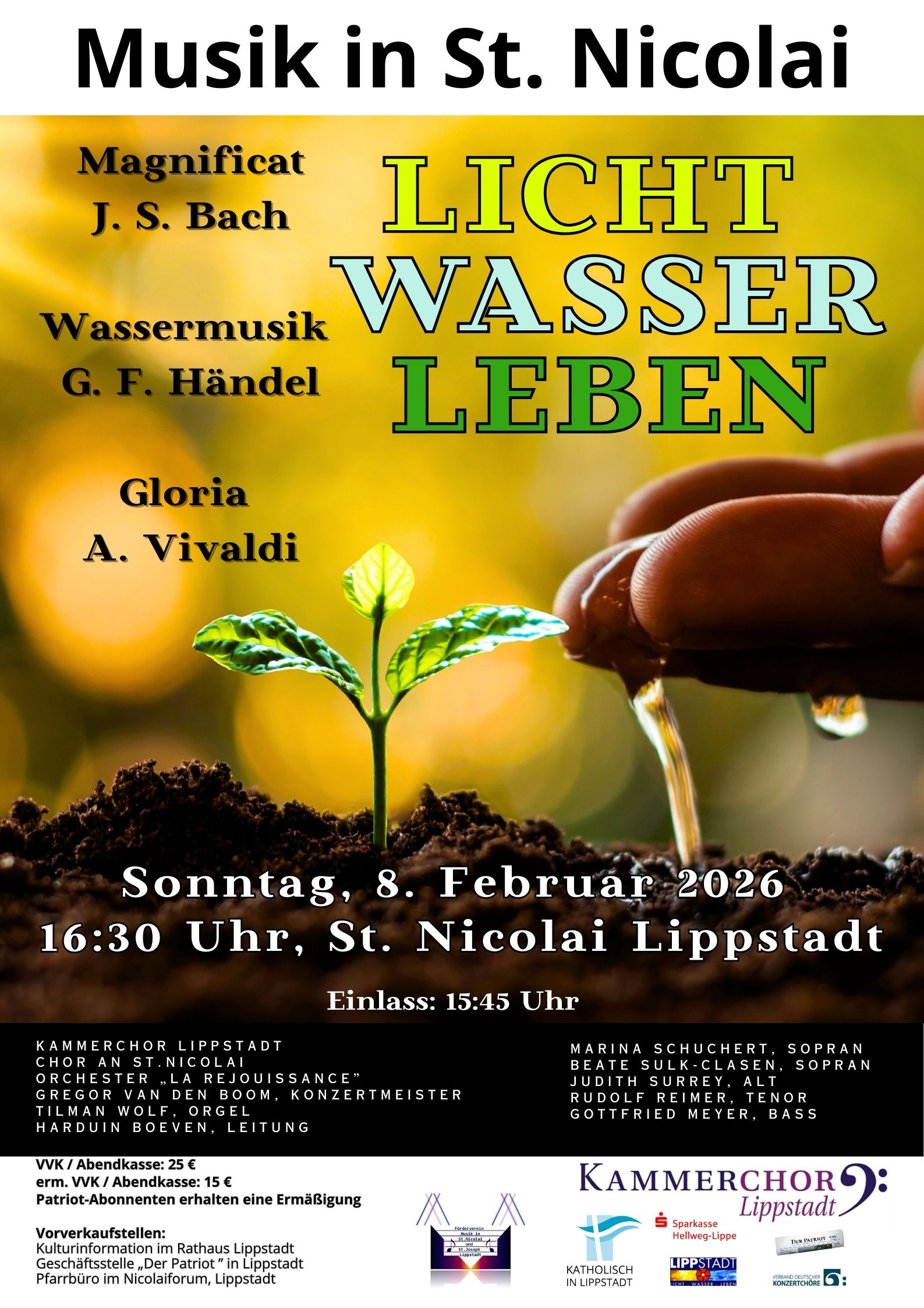 Der Turm der Nicolaikirche ist das älteste Bauwerk der Stadt Lippstadt aus dem 12. Jahrhundert. Der neugotische Kirchenraum von St. Nicolai ist erheblich jünger, hatte aber im letzten Jahr ein markantes Jubiläum: vor 150 Jahren wurde die Kirche geweiht.Aus diesem Anlass findet ein festliches Konzert am 08.02.2026 statt. Unter dem Lippstädter Motto “ Licht, Wasser, Leben“ präsentieren der Kammerchor Lippstadt, der Chor an St. Nicolai, Vokalsolisten und das Orchester “ La rejouissance“ ein Programm mit bekannten Meisterwerken des Barock: von J.S. Bach erklingt- in zeitlicher Nähe zum Fest Mariä Lichtmess- das Magnificat in D-Dur. Diese Komposition ist sehr vielschichtig und abwechslungsreich durch die musikalische Textausdeutung des „Lobgesangs Mariens“. Das Thema Wasser lässt das Orchester in der Wassermusik von Händel präsent werden. Die Zuhörerinnen und Zuhörer können sich u.a. auf die bekannte Hornpipe freuen. Italienische Lebensfreude ist in Antonio Vivaldis beliebtestem Chorwerk ,seinem Gloria aus dem Jahr 1715, zu spüren. Eingängige Melodien, gepaart mit markanter Rhythmik, begeistern und berühren auch heute noch die Menschen in aller Welt.
